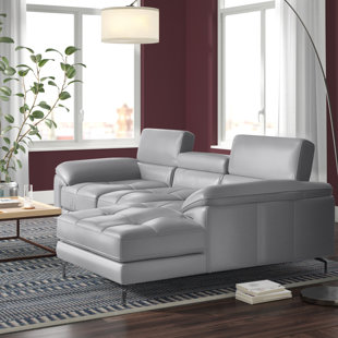 This genuine leather sectional gives ultra modernistic vibes and plenty of seating space to your living room layout. The Fifty-shaped frame is built on sled-style legs with a shiny chrome finish, and information technology features biscuit-tufted accents and pleated details for a tactile wait. It's wrapped in Italian leather in your choice of solid hue. The seat and back cushions are filled with foam, giving you plenty of support while you read or sentry your favorite movie. Plus, this exclusive has adjustable head cushions and armrests for an extra layer of comfort in your space.